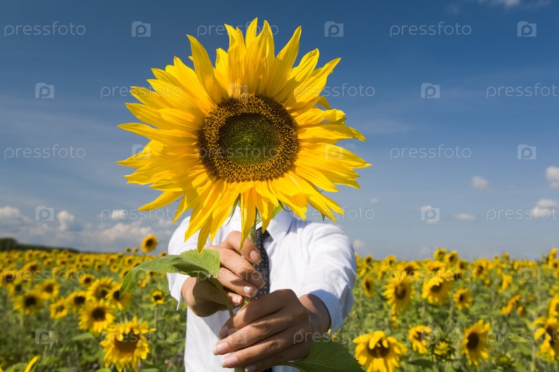Изображение женского лица, скрывающегося за подсолнечником на открытом воздухе