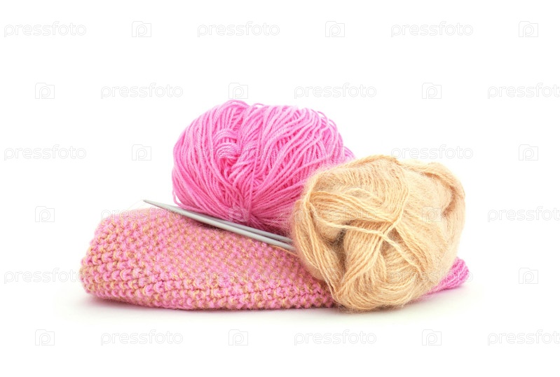 Мотки пряжи, вязание и спицы на белом фоне