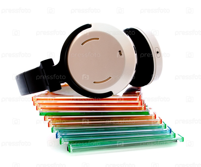 Беспроводные наушники и стопка компакт-дисков на белом фоне