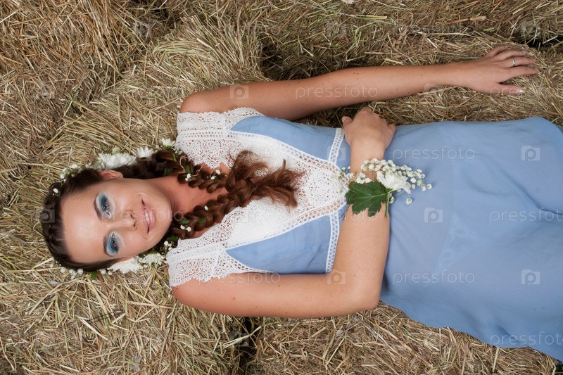 Красивая девушка лежит на сене
