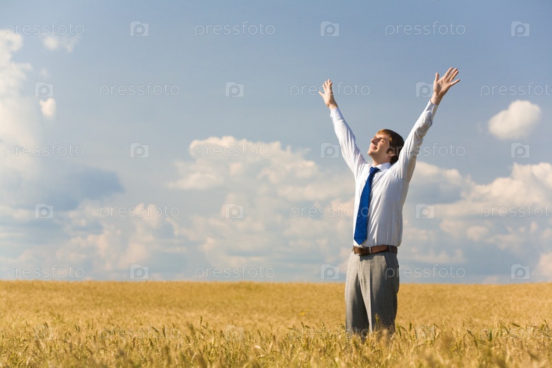 Изображение счастливого бизнесмена, наслаждающегося жизнью и свободой на пшеничном поле