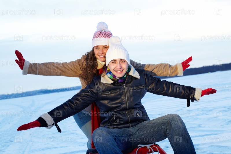 Счастливая пара катается на санках