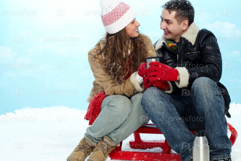 Молодая пара пьет чай зимой на природе